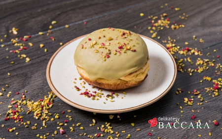 Pączek z ciasta drożdżowego z kremem pistacjowym ze 100% pasty pistacjowej. Dostępny tylko w okresie karnawału.