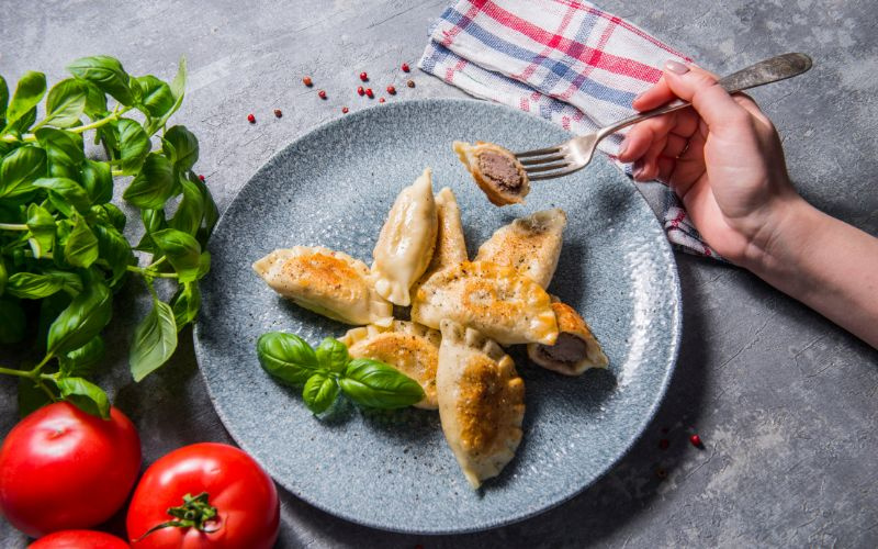 - Smaczne pierogi z farszem z wysokiej jakości mięsa z dodatkiem cebuli i przypraw.